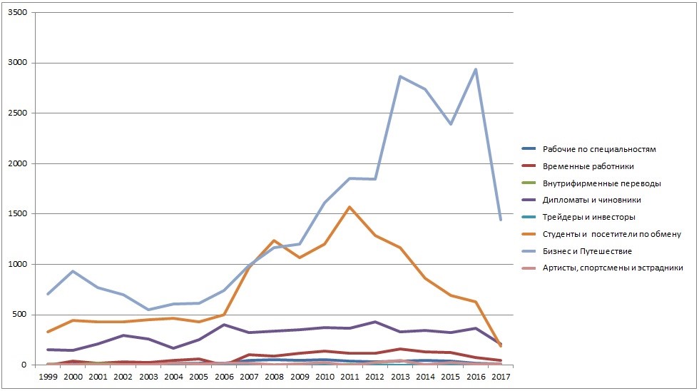 Рисунок 2: Граждане Кыргызстана, принятые в США в категориях с не-иммиграционным статусом.