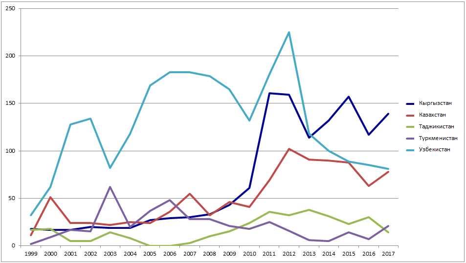 Глядя на рисунок 3, может показаться, что граждане Кыргызстана просят о предоставление убежища в гораздо большем количестве по сравнению с Туркменистаном, страной с похожим количеством населения, но с гораздо более авторитарным режимом. Однако это можно объяснить тем, что заявления о предоставлении убежища должны быть заполнены в пункте въезда или на территории Соединенных Штатов. Ограничения, налагаемые на международные поездки в Туркменистане, затрудняют возможности людей ходатайствовать о предоставлении убежища.