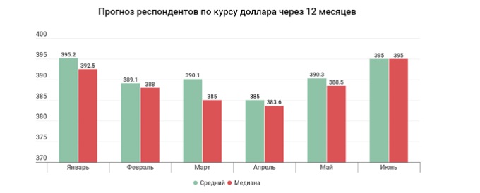 «Средний курс по паре USD/KZT через месяц ожидается на уровне 385,2 тенге за доллар. Тогда как медиана ожиданий – 385,0 тенге за доллар. Отметим, что на момент проведения опроса (04-10 июня) курс доллара США на KASE колебался в довольно узком боковом коридоре 383,0 — 384,5», — пишет АФК.