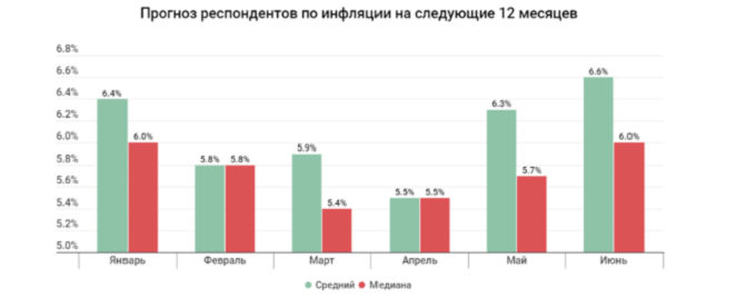Что касается других индикаторов, тут также не все оптимистично. Рост ВВП за следующие 12 месяцев эксперты прогнозируют на уровне 3,3% (при медиане в 3,5%). Эта оценка не меняется с февраля. Учитывая, что фактический рост за это время увеличился с 2,9 до 4%. То есть прогнозная оценка остается стабильной независимо от текущих показателей экономики.