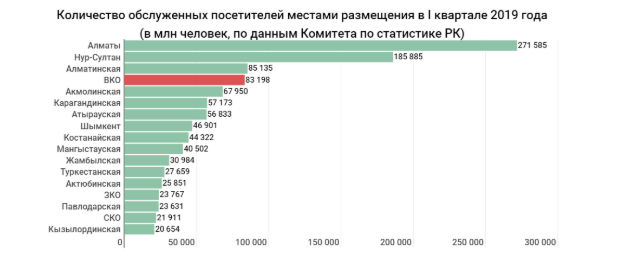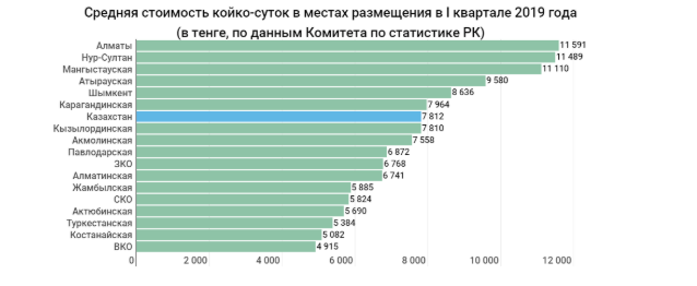 Еще один важный момент – это цены. Они выросли везде. Больше всего в местах размещения Мангыстауской, Алматинской (обе – на 3,7 тыс. тенге) и Восточно-Казахстанской (3,2 тыс.) областях. В среднем по республике цены увеличились на 2 622 тенге: по итогам января-марта 2019 года средняя стоимость одних койко-суток составляла 7 812 тенге. Самые дорогие номера – в Алматы, Нур-Султане и Мангыстауской области. Самые дешевые (даже несмотря на почти трехкратный рост) – в ВКО (менее 5 тыс. тенге).