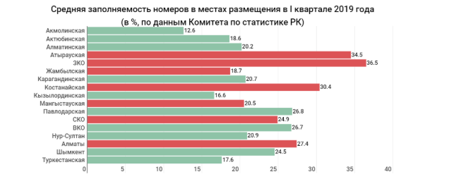 Динамика отличается от изменения количества клиентов. Так, в Атырауской области при росте обслуживаемых посетителей на 13,1 тыс. человек средняя заполняемость койко-мест снизилась с 32,3 до 24,9%, а номеров – с 35,8 до 34,5%.