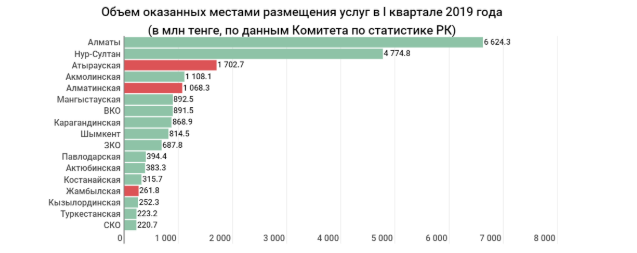 В целом половина всего объема оказанных местами размещения услуг приходится на Алматы (6,6 млрд) и Нур-Султан (4,8 млрд). Меньше всего заработали отели Туркестанской и Северо-Казахстанской областей – чуть более 220 млн тенге. При этом в трех регионах показатель по сравнению с январем-мартом 2018 года снизился. Совокупно Атырауская, Алматинская и Жамбылская области заработали меньше на 486,3 млн тенге.