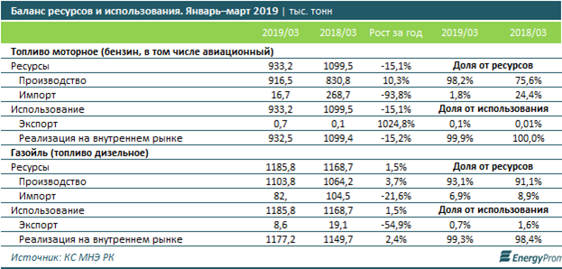 По итогам января–марта 2019 года казахстанские производители обеспечивают уже 98,2% спроса на бензин и 93,1% — на дизтопливо. Благодаря росту производства и политике импортозамещения в секторе, импорт бензина сократился почти на 94% за год, до 16,7 тыс. тонн. Экспорт увеличился в 11,2 раза за год, однако его объёмы незначительны — всего 665,9 тонн.