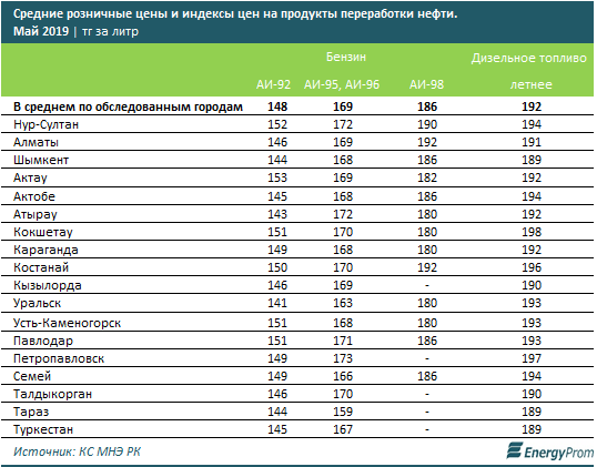 По итогам мая 2019 года в среднем по городам страны цены на популярный бензин АИ-92 снизились на 6,9% за год, до 147,6 тенге за литр. Стоимость АИ-95/96 также снизилась — на 3,8%, до 168,6 тенге за литр; стоимость АИ-98 — на 3,4% за год, до 185,9 тенге за литр. Примечательно, в то же время, что цены на летнее дизельное топливо сильно выросли — на 13,5%.