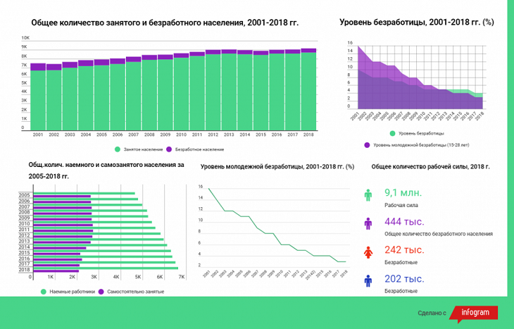 Одним из основных факторов, который учитывается при разработке стратегии социально-экономического развития страны, является занятость трудоспособного населения. По данным Комитета статистики Министерства национальной экономики Республики Казахстан (КС МНЭ РК)в 2018 году, занятое население в РК насчитывалась 8,7 млн. человек, безработное население республики составило 444 тыс. человек.