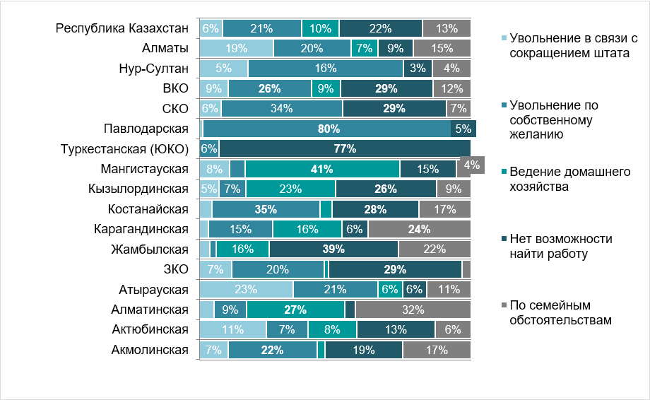К примеру, самый высокий показатель в Павлодарской области – 80% жителей уволились по собственному желанию и всего у 5% населения нет возможности найти работу. Далее по вышеуказанной причине идет Костанайская область (35%), СКО (34%) и ВКО (26%). При этом 77% населения Южно-Казахстанского (нынешний Туркестанская область) региона не могут или нет возможности найти работу. В Алматинской области и в городе Нур-Султан данный показатель составляет всего 3%.