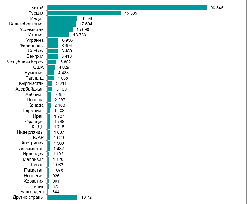 По количеству иностранных специалистов с 2010 по сегодняшний день Китай лидирует в списке ТОП стран (31,2% ИРС). Это связано со строительством автотранспортной магистрали Западная Европа – Западный Китай. Кроме того, в структуре прямых инвестиций среди азиатских стран основная доля приходится именно на Китай.