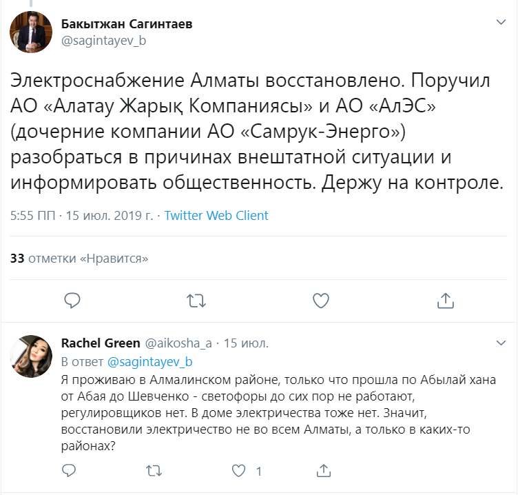 15 июля в Алматы произошёл массовой сбой в системе подачи электричества. С 14:00 об отсутствии света сообщали жители восьми районов, а также была остановлена работа всех троллейбусов и метро. Несмотря на масштабы случившегося, жители узнали о действиях акима только в шесть вечера, когда электроснабжение начало восстанавливаться.