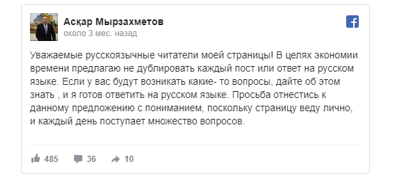Единственный, кто формально начал прямой диалог с пользователями – глава Жамбылской области. Он иногда даже отвечает на вопросы в комментариях под постами. По стилю ответов можно предположить, что аким пишет собственноручно. Но стоит напомнить, что Жамбылская область в 2019 году занимает предпоследнее место по средней зарплате среди регионов РК, спустившись на один пункт по сравнению с прошлым годом.