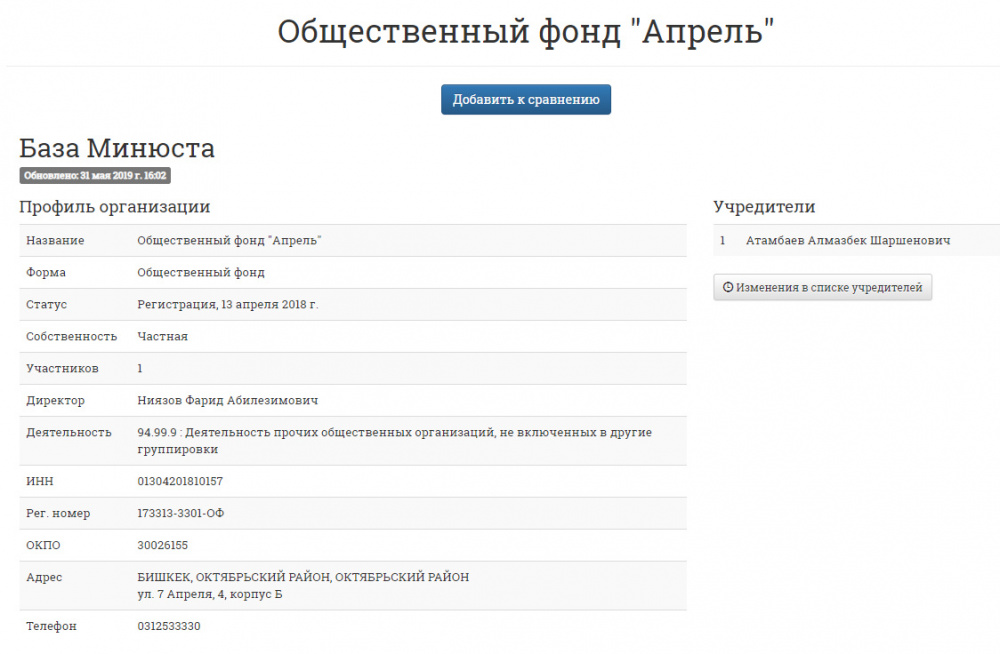 3. Общественное объединение "Республиканский общественный экспертный совет по вопросам Устойчивого человеческого развития". Атамбаев является одним из учредителей организации, но юрлицо не функционирует;
