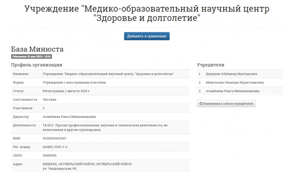 4. Учреждение "Медико-образовательный научный центр "Здоровье и долголетие" (МОНЦЗиД). Учредителем является Раиса Атамбаева. Объект находит в здании общежития КГМА в районе Суеркулова-Тыныстанова;