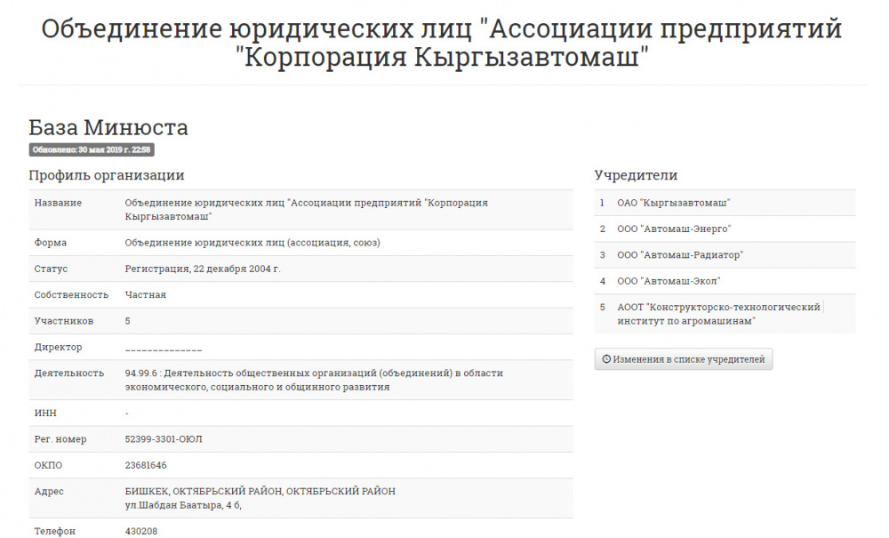 6. Объединение юридических лиц "Ассоциации предприятий "Корпорация Кыргызавтомаш" (учредителями объединения являются: ОАО "Кыргызавтомаш", ООО "Автомаш-Энерго", ООО "Автомаш-Радиатор", ООО "Автомаш-Экол", АООТ "Конструкторско-технологический институт по агромашинам").