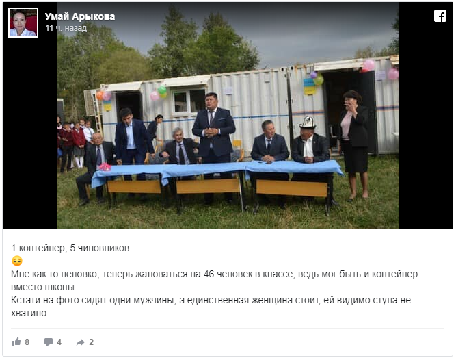 В открытии приняли участие аким Нарынского района Семетей Черикбаев, начальник областного управления образования Касымбек Мамытов и другие госслужащие. На фотографии видно, что в импровизированном президиуме сидят пять человек. Снимок бурно обсуждают пользователи соцсетей, которые критикуют чиновников за церемонию открытия такой школы.