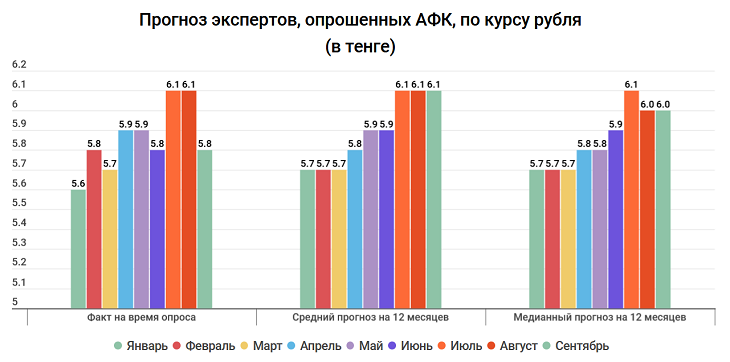 Медианные ожидания по сравнению с августом также остались без изменений. Как минимум половина опрошенных считает, что курс рубля через год будет на уровне 6 тенге. Таким образом, профессиональные участники финансового рынка считают, что какие-либо резкие колебания маловероятны.