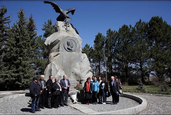 Участники международной научно-практической конференции «Н.М. Пржевальский – великий евразиец» у памятника ученому в г. Караколе (апрель 2019 г.)