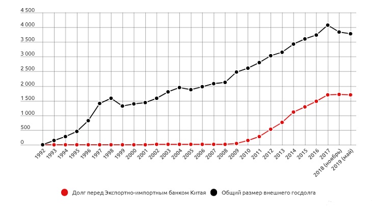Китай также инвестирует значительные средства в Кыргызстан и остается крупнейшим кредитором страны, владея почти половиной внешнего долга Кыргызстана (1,7 млрд долларов из 3,8 млрд долларов в 2018 году).