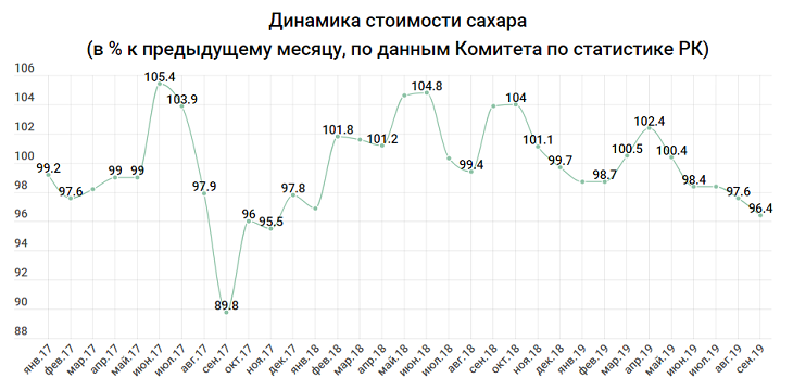 Ряд продуктов питания сдерживает общую продуктовую инфляцию. Вновь дешевеет сахар – на 3,6%, это самое сильное снижение за месяц с ноября 2017. Вообще, в Казахстане он дешевеет с начала лета. Сейчас его стоимость на 8,3% ниже, чем в начале года. Да и в целом в последние годы сахар чаще дешевеет, чем дорожает.