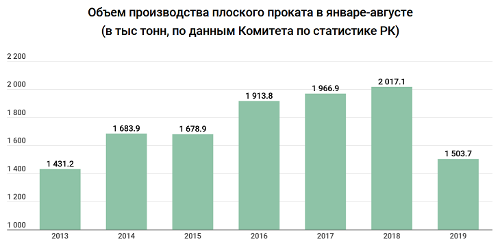 Общее падение производства по итогам неполных трех кварталов превышает 25%. По данным Комитета по статистике, за 8 месяцев 2018 года в Казахстане было произведено более 2 млн тонн плоского проката, за аналогичный период 2017 и 2018 года – более, 1,9 млн. Нынешние объемы производства – минимальные с 2013 года.