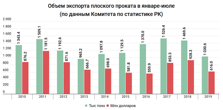 Плоский прокат традиционно является одним из главных экспортных товаров Казахстана. Однако его важность на фоне падения производства постепенно снижается. В январе-июле общий объем зарубежных продаж в натуральном выражении едва превысил 1 млн тонн – на 30% меньше показателей за аналогичный период предыдущего года. Сумма сделок упала на треть – до 616 млн долларов. Сейчас черная металлургия для внешнеторговой деятельности республики менее важна, чем цветная — объемы продаж одних только ферросплавов превышают 1,1 млрд долларов.