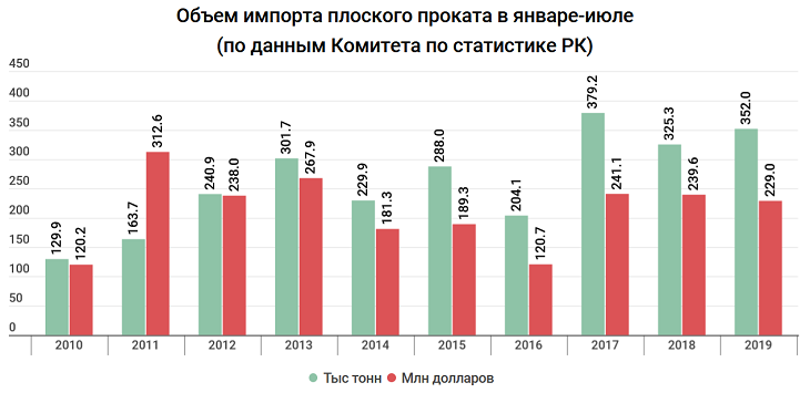 С другой стороны, импорт находится на высоком уровне. За 7 месяцев в Казахстан завезли 352 тыс. тонн плоского проката. Больше за последние 10 лет было лишь в 2017 году. Объем импорта составил $229 млн. Это меньше, чем заплачено за ввозимые в республику косметику, грузовики, все виды компьютеров или удобрения. При этом более 76% импорта приходится опять же на Россию.