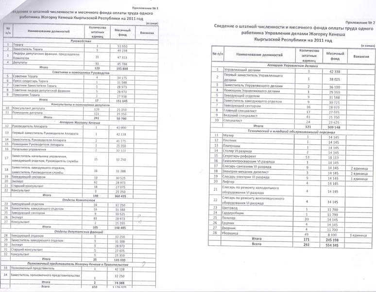 Администрацией сайта talap.kg были получены официальные документы управления делами Жогорку Кенеша КР о штатной численности и о месячном фонде оплаты труда работников Жогорку Кенеша в 2011 году.