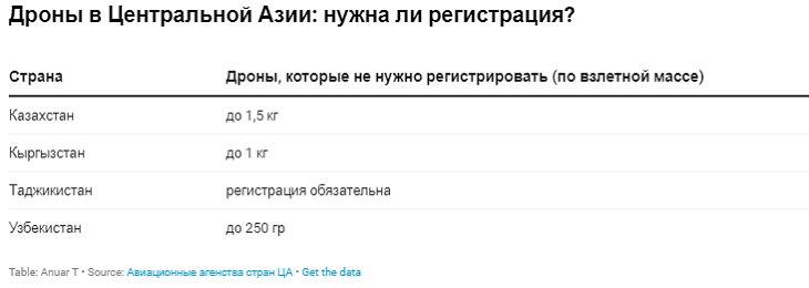 Например, в Казахстане регистрация дронов обязательна тогда, когда вес с максимальной взлетной массой БПЛА превышает полтора килограмма. Это самый большой вес, который не подлежит регистрации, среди всех стран Центральной Азии.
