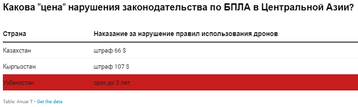 В Кыргызстане тоже предусмотрен штраф, но если нарушитель убил другого человека дроном, то его ждет реальный срок до 5 лет. В Казахстане тюремные сроки за убийство людей дронами не предусмотрены, пока подобных прецедентов не было. [В Таджикистане за отказ регистрации дрона в комитете гос. безопасности возможно будет наложен штрафа (правда, сумма штрафа не указывается в открытых источниках) – прим. ред].