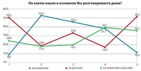 Самая высокая доля двуязычных среди казахов (35,7%), самая низкая – среди русских (5,7%). Эта тенденция сохранилась еще с советских времен. Хотя тогда доля казахов, владеющих русским, была значительно выше, чем сейчас.