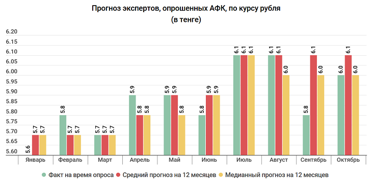 Что касается рубля, то прогнозы относительно его стоимости достаточно консервативны. Начиная со второй половины сентября стоимость российской валюты крутится в районе 6 тенге. И по мнению, экспертов далеко от этого уровня не уйдет — ни через месяц, ни через год. Медианный прогноз экспертов, принимающих участие в опросе, не меняется уже 3 месяца — 6 тенге за 1 рубль. Средний прогноз чуть выше – 6,1 тенге. При этом и он остается неизменным, причем уже 4 месяца подряд.