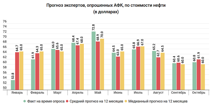 «Средний прогноз стоимости нефти Brent через 12 месяцев вырос с $60,6 до $61,9 за баррель (+2,1%). При этом на текущий момент баррель Brent торгуется за 58,0 долларов США, и не превышал отметки 58,4 долларов за баррель во время проведения опроса. Другими словами, эксперты улучшили свои прогнозы, несмотря на текущую динамику цен», — отмечают в АФК.