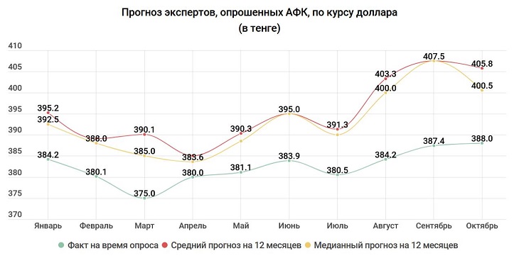 Если смотреть на год вперед, то ослабление очевидно, но не сильное. Через 12 месяцев согласно медианному прогнозу (половина экспертов считает, что курс будет выше, половина – что ниже) доллар будет стоить 400,5 тенге. Согласно среднему прогнозу – 405,8 тенге. Это значит, что даже несмотря на нынешнюю ситуацию ожидания экспертов относительно будущего тенге улучшились. Ведь месяц назад прогноз составлял 407,5 тенге.