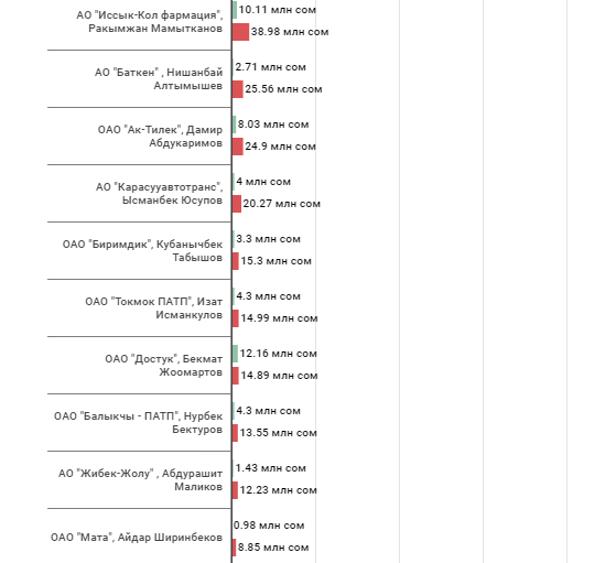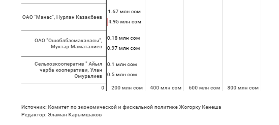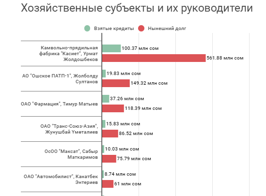 Несомненно, вызывает интерес, кто из политиков имеет отношение к частным предприятиям, долги которых хотят списать. Среди владельцев некоторых предприятий, стоящих на пороге банкротства, депутаты Жогорку Кенеша и крупные бизнесмены.