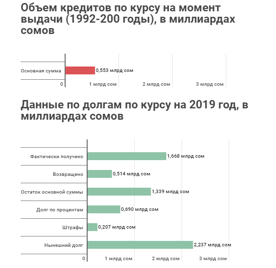 По данным Комитета Жогорку Кенеша по экономической и фискальной политике, 25 компаний в промежутке между 1992-м и 2000 годами получали технические кредиты у Германии, Турции, России, Индии, Японии, Нидерландов, Азиатского банка развития и Всемирного банка. Все расчеты производились в иностранной валюте, по курсу на тот момент в переводе на сомы общая сумма кредитов составляет 553 миллиона 794 тысячи сомов. При расчете по нынешнему курсу эта сумма равна уже 1 миллиарду 668,56 миллиона сомов. При этом было выплачено только 30 процентов долга, остальное вовремя не было погашено. В итоге были начислены проценты и пеня, и теперь эти предприятия обязаны платить в 4-5 раз большие суммы.