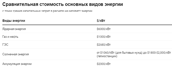 Приведем сравнительную стоимость основных видов энергии с точки зрения капитальных затрат в расчете на киловатт энергии: