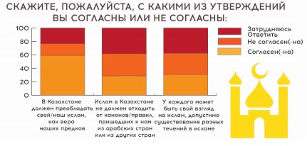 Практически 60% респондентов считают, что «в Казахстане должен преобладать свой ислам как вера наших предков». По территориальному распределению 72,1% на юге, 66,5% на востоке и 60,8% на западе.