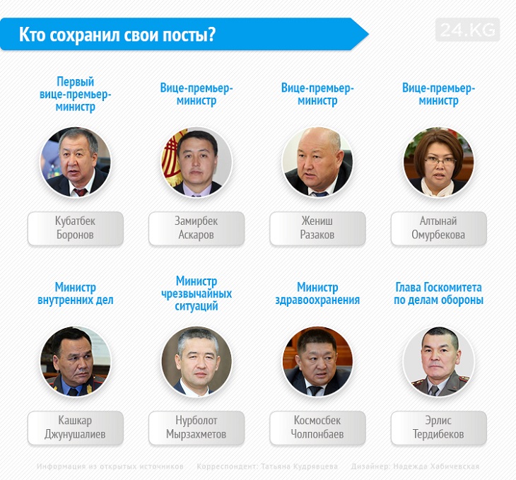 В правительстве сменились министр экономики, образования и науки, сельского хозяйства, председатели Госкомитета информационных технологий и связи и Госкомитета национальной безопасности. Кроме того, место работы сменил председатель Фонда по управлению госимуществом Ренат Тулебердиев.