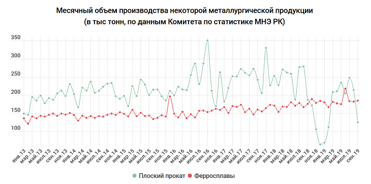 Среди негативных моментов – проблемы в черной металлургии. Объемы производства сократились на 5,1%. При этом в цветной металлургии, наоборот, отмечается рост на 7,5%. До осени 2018 года производство ферросплавов было меньше, чем плоского проката, но за последний год ситуация изменилась. В результате цветная металлургия стала более стабильной, а оттого и объемы производства тут нередко оказываются выше, чем у черной.