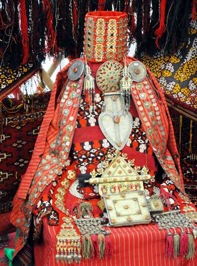 Обильное убранство костюма ювелирными изделиями сложилось на территории современного Туркменистана очень давно, вероятно, не менее двух тысячелетий тому назад. Об этом молено судить по терракотовым статуэткам богинь из Маргианы (последние века до н.э. и начало н.э.), уже имеющим изображения многочисленных блях на одеждах и сложные высокие головные уборы, подобные дошедшим до наших дней.