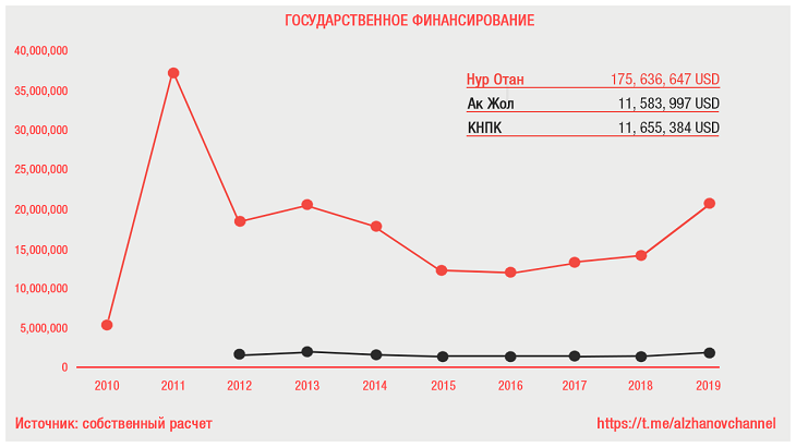 За период с 2010 по 2019 год, три парламентские партии получили в общей сумме 198,876,028 USD из государственного бюджета (Нур Отан – 175,636,647; Ак Жол – 11,583,997; Коммунистическая народная партия Казахстана – 11,655,384). Избирательная система не предусматривает иное косвенное финансирование избирательных кампаний (например, доступ к СМИ в виде бесплатного эфира) для обеспечения более равных возможностей для непарламентских партий.