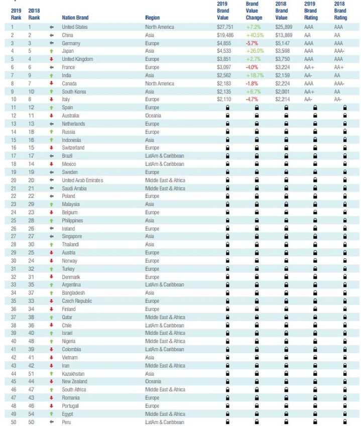 Германия стала единственной страной в тройке, но не в десятке, стоимость бренда которой упала. В 2019 бренд ФРГ оценивается в $4,855 трлн, упав на 5,7%. В 2018 стоимость Германии как бренда достигала $5,147 трлн.