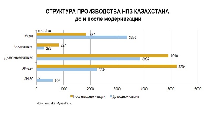 Структура производства главных НПЗ Казахстана до и после модернизации