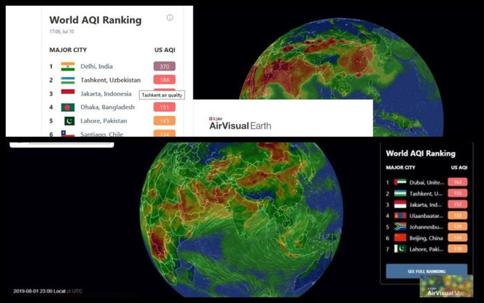 Данные о качестве воздуха в Ташкенте 10 июля и 1 августа. Скриншоты пользователей соцсетей. Ташкент — на втором месте по загрязнению воздуха.