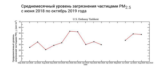 Среднегодовое значение по РМ2,5 в Ташкенте составило 36 мкг/м³. Самые высокие показатели концентрации мелкодисперсных взвешенных частиц пришлись на ноябрь-декабрь 2018 года. Предположительно это также связано с отопительным сезоном. Менее чем в 2 км от посольства США находится ТЭЦ.