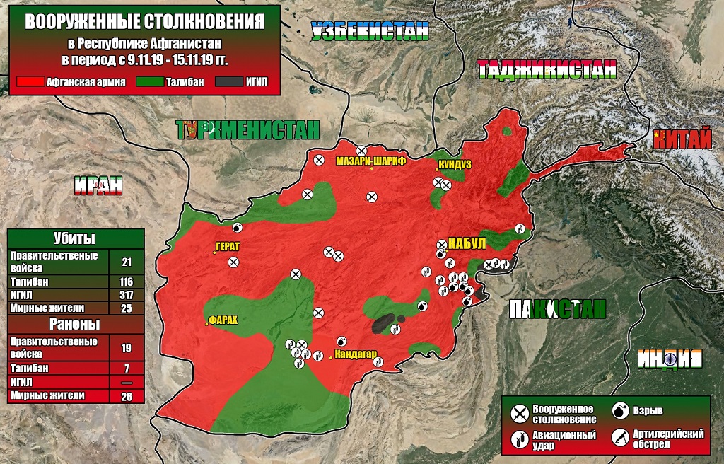 21 силовик, 25 мирных жителей и 25 боевиков (19 талибов и 6 ИГ) погибли за неделю в Афганистане. Официальные сводки сообщают об уничтожении и аресте более 430 боевиков Талибана и ИГ, что не имеет подтверждений.