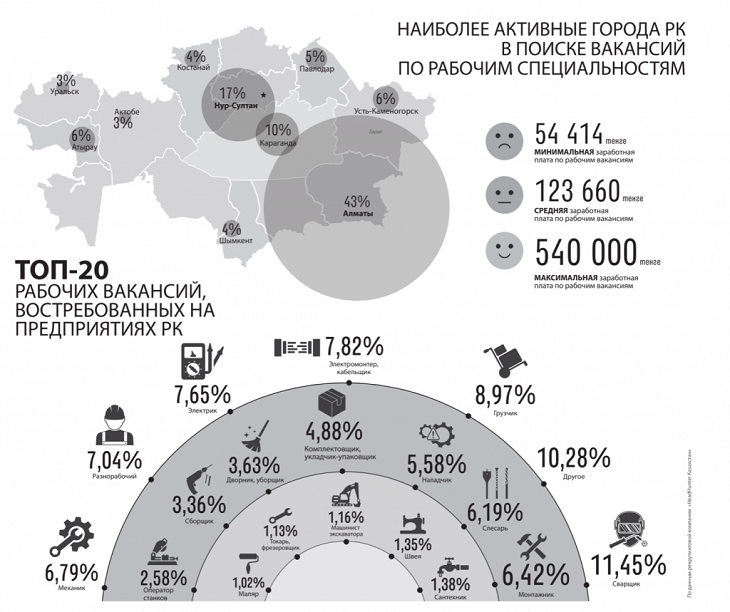 На официальном сайте компании «HeadHunter Казахстан» значится, что на середину ноября 2019 года здесь было размещено 22,4 тыс. трудовых вакансий. Директор отдела маркетинга и PR «HeadHunter Казахстан» Анна Шевченко пояснила, что 5,46% всех востребованных вакансий по Казахстану приходится на рабочий персонал.