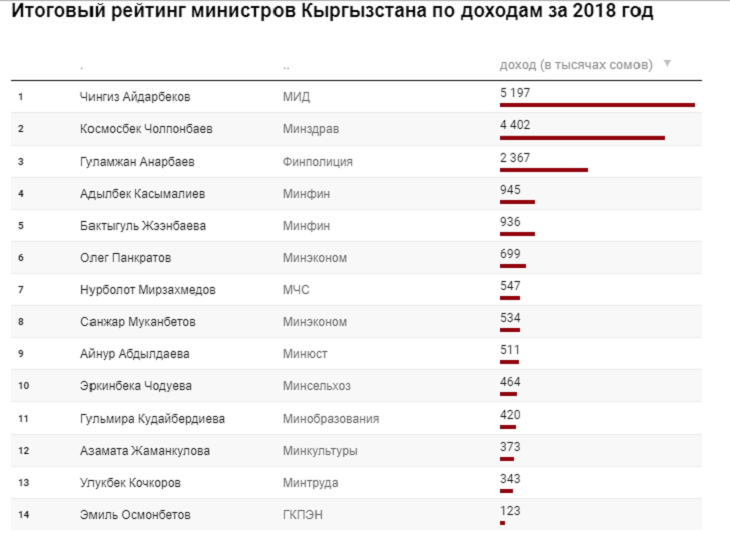 Economist.kg рассчитал, что в среднем годовой доход министра в 2018 году составил 1 млн 276 тысяч сомов (в 2015 году он равнялся 989 тысячам сомов). Среднемесячный министерский доход – 106 тысяч сомов (82 тысячи в 2015-м), то есть почти в семь раз больше чем оклад среднестатистического кыргызстанца (15.7 тысяч сомов). Также редакция составила рейтинг министров по полученным доходам за 2018 год.