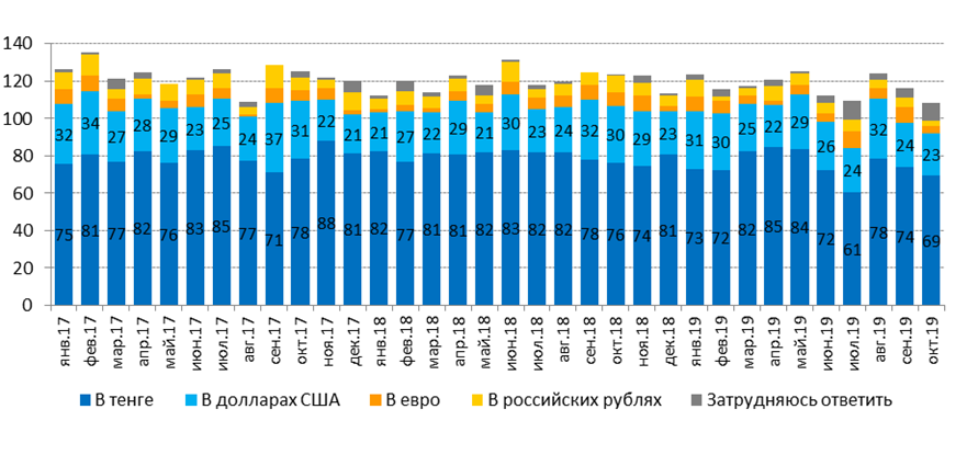 Как бы то ни было, данные опроса преподнесли сюрприз, так как они показывают одновременное снижение долей опрошенных по всем валютам, упоминающимся в соответствующем вопросе! Так, доля тех, кто предпочитает тенге, опустилась с сентябрьского уровня в 74% до 69% в октябре, долларs – с 24% до 23%, в евро – с 8% до 4%, а в российских рублях – с 6% до 3%.