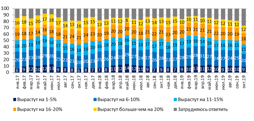 К тому же в октябре годовая инфляция и в самом деле выросла до 5,5% с 5,3% в сентябре. Доля тех, кто ожидает роста потребительских цен на 1-5% в ближайшие 12 месяцев, опустилась с 10% до 9%, как и тех, кто ожидает их увеличения на 6-10%, — таковых оказалось 20% против 25% месяцем ранее. Доля опрошенных, ожидающих инфляцию в диапазоне 11-15%, не изменилась, — их по-прежнему 15%, как и тех, кто верит в наихудший сценарий с ростом цен более чем на 20% — 12%. Правда, немного снизилась доля ставящих на подъем цен в диапазоне 16-20%, — с 19% до 18%. Таким образом, 65% респондентов ожидают инфляцию в ближайшие 12 месяцев не ниже 6%.