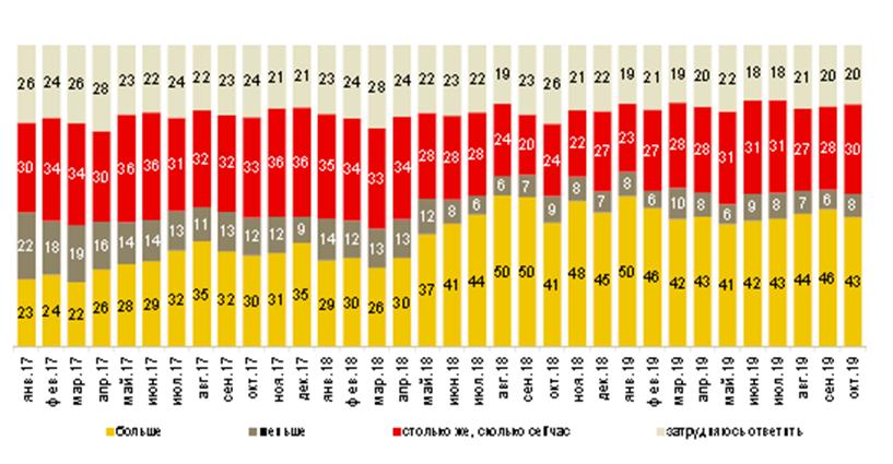 В России же, где Центробанк более эффективно и последовательно проводит политику инфляционного таргетирования по сравнению с казахстанским Нацбанком, в октябре инфляция продолжила снижение и опустилась за октябрь до 3,8% с 4,0% в сентябре. Неудивительно поэтому, что в РФ доля респондентов, ожидающих дальнейшего снижения потребительских цен в ближайшие 12 месяцев, весьма высока, хотя и снизилась до 56% с сентябрьского уровня в 57%. Правда, стало больше и тех, кто ждет ускорения инфляции, — доля таковых поднялась с 17% до 19%. Замедления же инфляционных процессов по-прежнему ожидают 7% опрошенных.